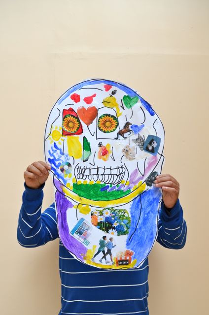 The next project that we done was a brain-storming exercise where the art group created two paper skulls filled with images that represent the things that each group loved about life.